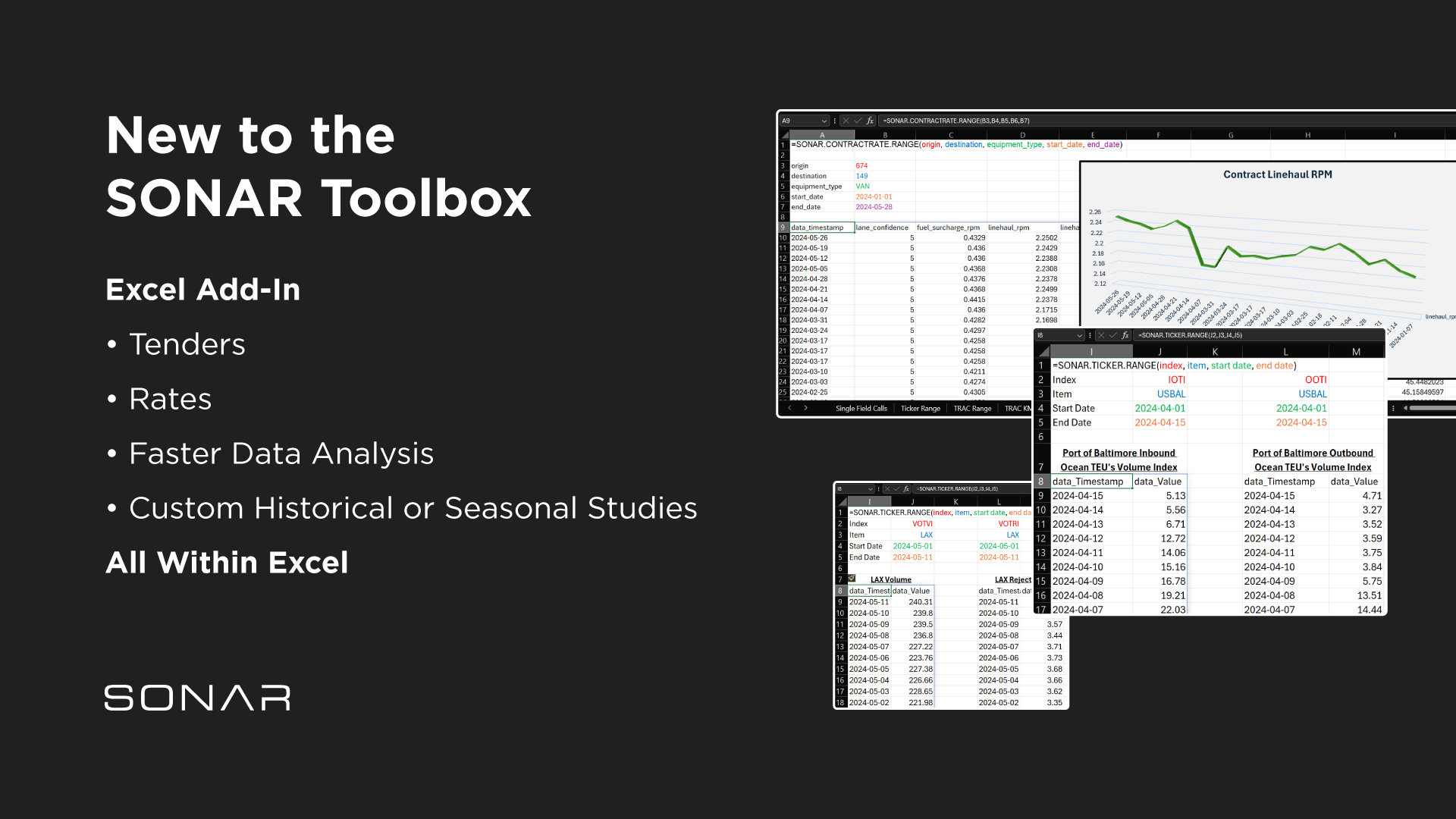 SONAR is the high-frequency freight market intelligence platform dedicated to powering businesses in the supply chain. SONAR provides users with exclusive, near real-time trucking, railroad, ocean and air freight transportation data and actionable intelligence, as well as the ability to benchmark, analyze, monitor and forecast your network against the market.