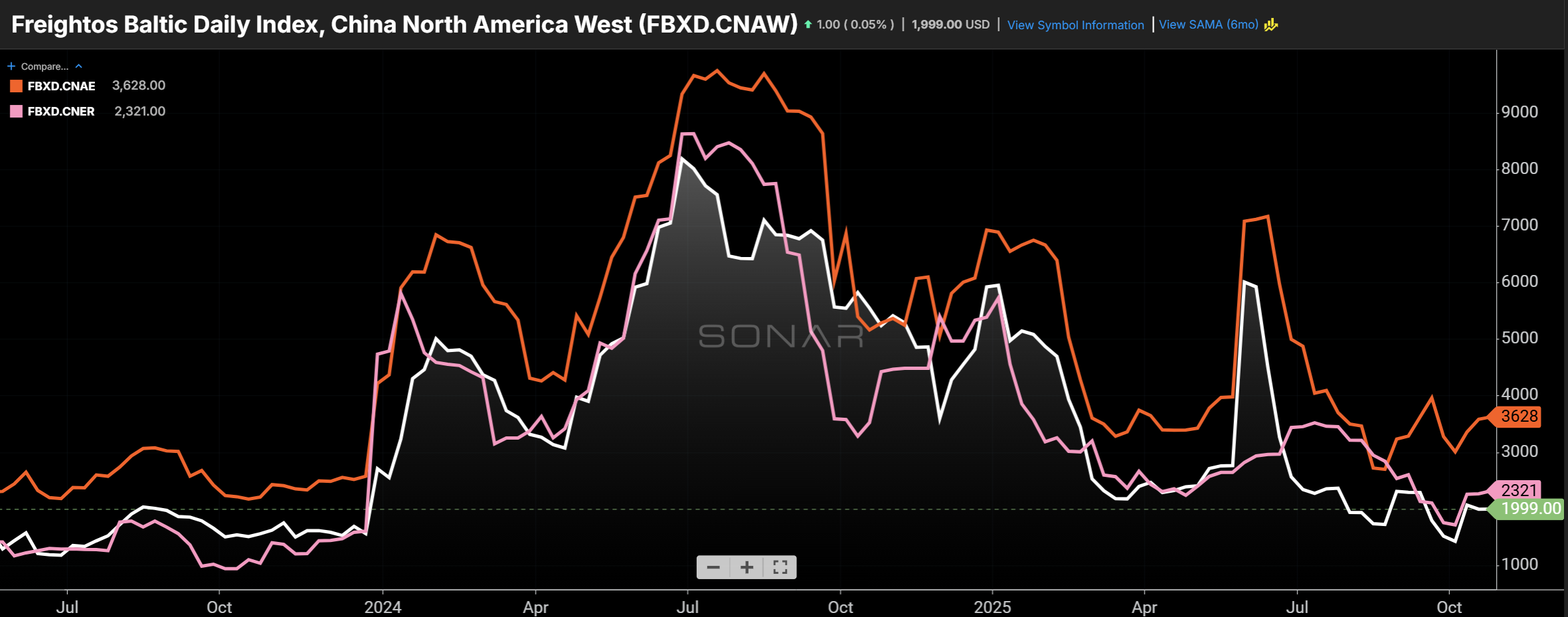 Spot rates to move 40’ containers from China to the US West Coast (white), the US East Coast (orange), and North Europe (pink) have all climbed since the start of the month. (Chart: SONAR) (Chart: SONAR)