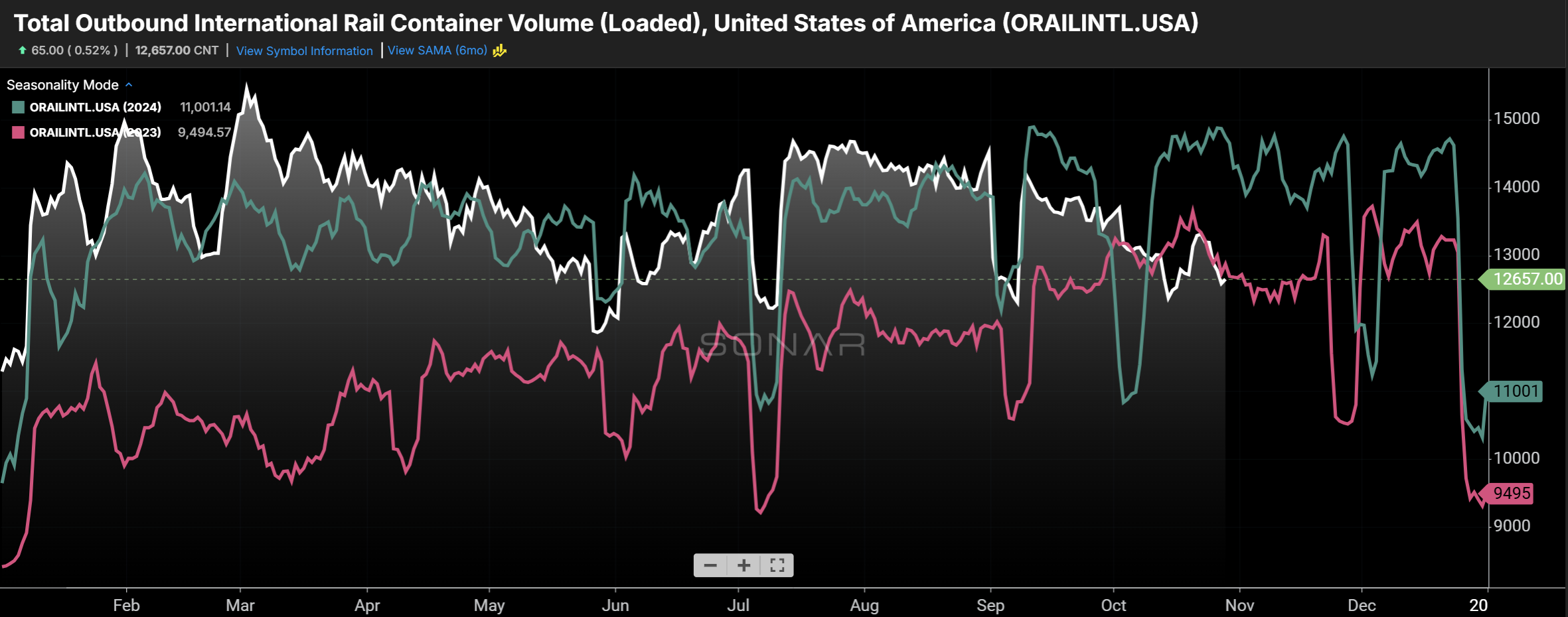 Loaded international intermodal volume in 2023, 2024, and 2025 in pink, blue, and white, respectively. (Chart: SONAR)