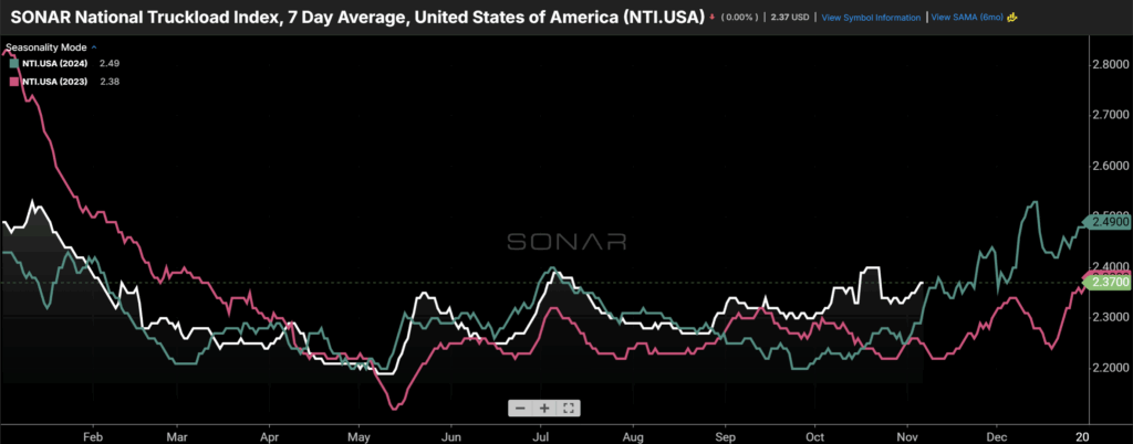 Average spot rates, displayed in the SONAR National Truckload Index (NTI.USA), increased in the first week of November and remain above year-ago levels against an increasingly difficult year-ago comparison. Going forward, the question is whether further reductions in capacity, combined with seasonal improvement in freight demand, will push spot rates to levels not seen in recent years. (Chart: SONAR)