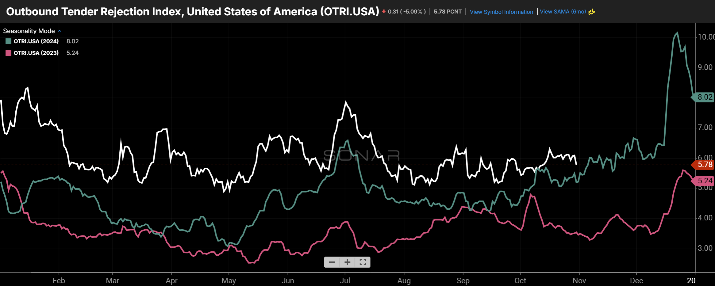 The nationwide tender rejection rate currently stands at 6.36% and is on an upward trend as capacity is removed from the industry and the holidays approach. (Chart: SONAR)